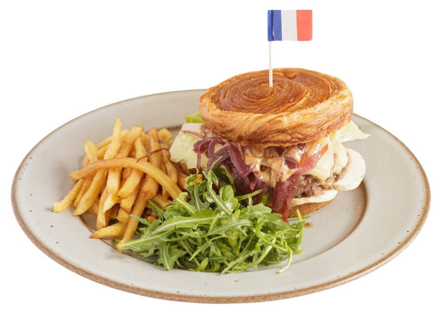 Croissant Roll’n bun filled with a 140g beef patty, cooked to your preference, layered with melted comté cheese, salad, fresh tomato, sliced button mushrooms, caramelized onions, pickles, and house-made mayonnaise. Seasoned with paprika and smoked salt. Served with fresh salad and homemade fries.