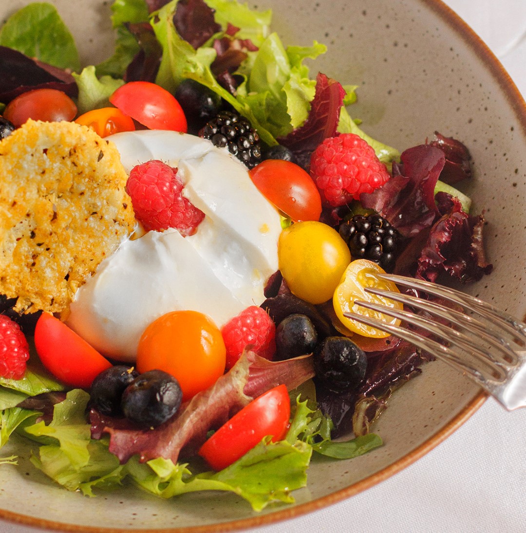 Creamy burrata, tangy fruit, mini-tomatoes, salad