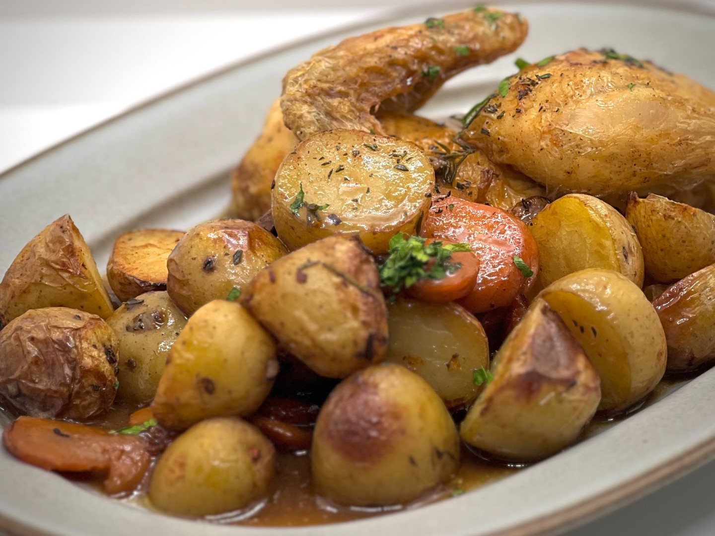 Roasted half-oquelet, grenaille potatoes, carrots, mushrooms and thyme-scented jus.
