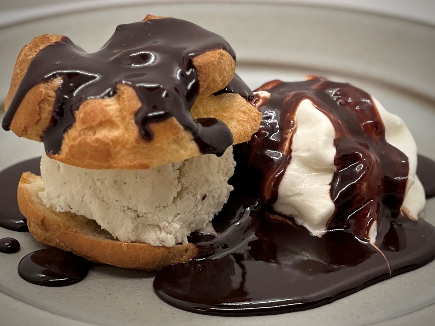 Homemade choux pastry, vanilla ice cream, hot chocolate, whipped cream
