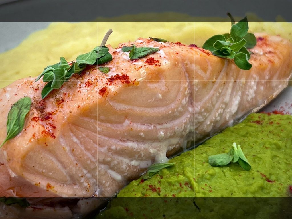 Semi-cooked salmon, seasoned with chili, marjoram, smoked salt and pepper, served with mashed potatoes and peas.