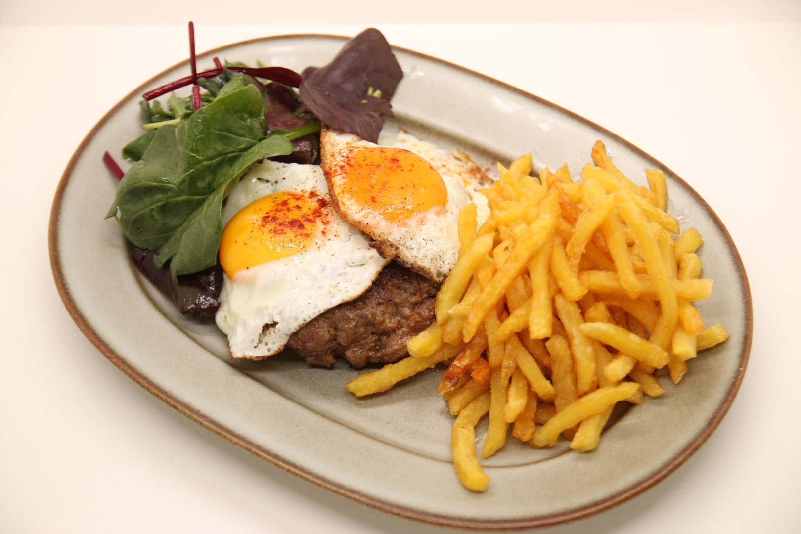Grilled ground beef steak, topped with two fried eggs, served with home fries and salad.