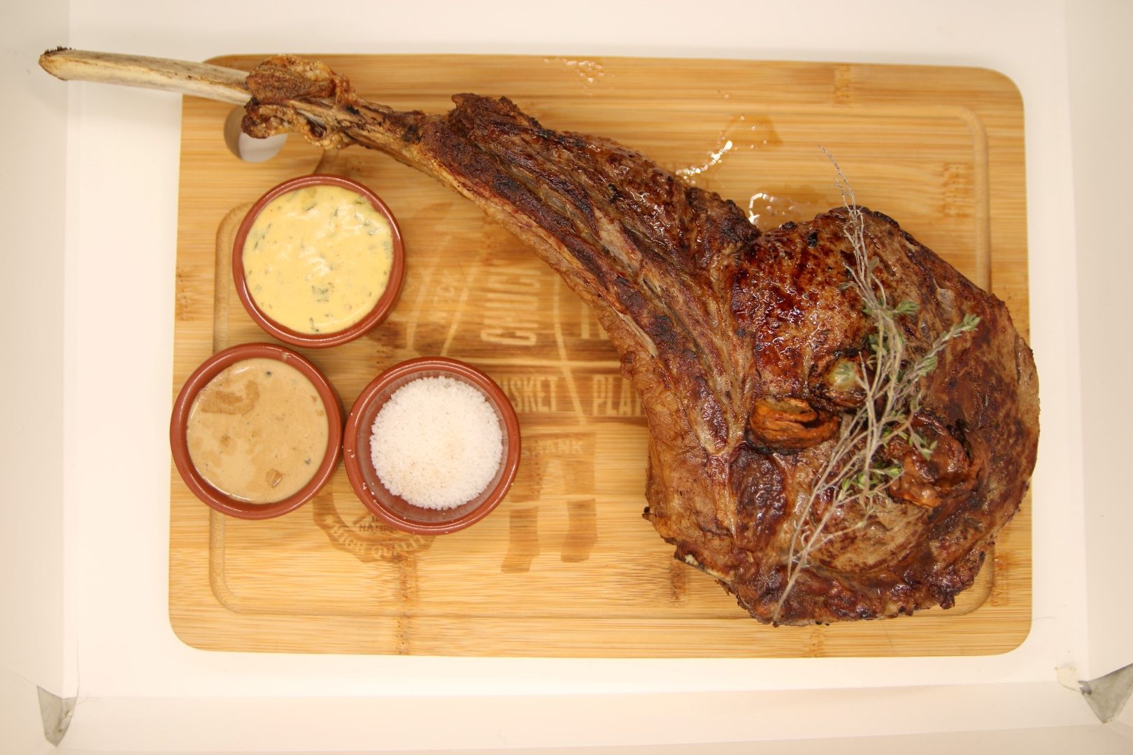 Imposing piece of beef on the bone, approx. 1.2kg, served with salad, two garnishes and a choice of two sauces.