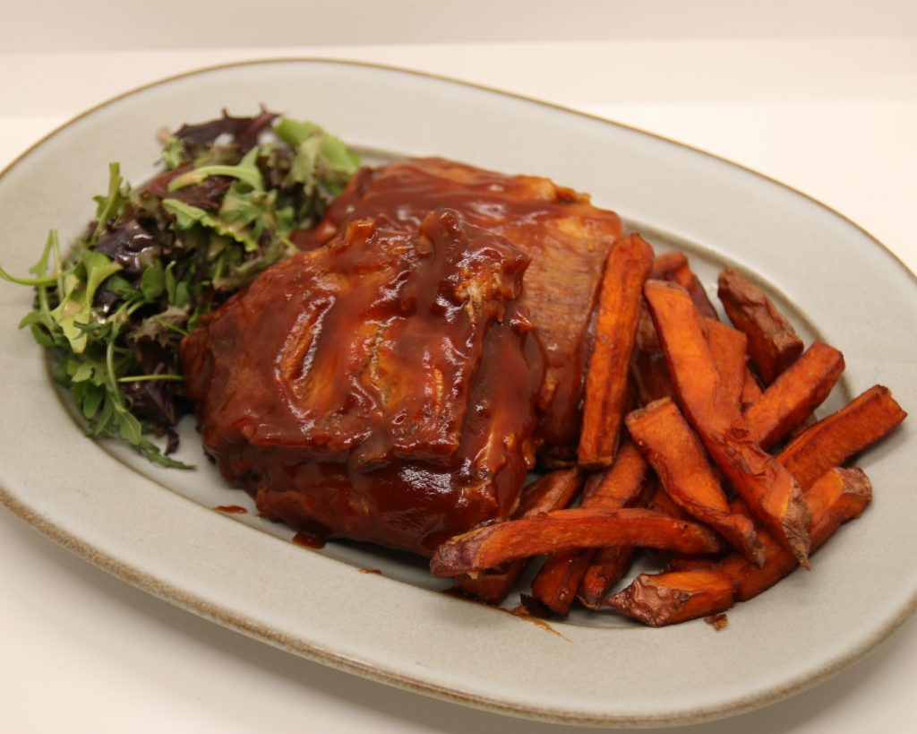 Grilled pork ribs topped with barbecue sauce, served with sweet potato fries.