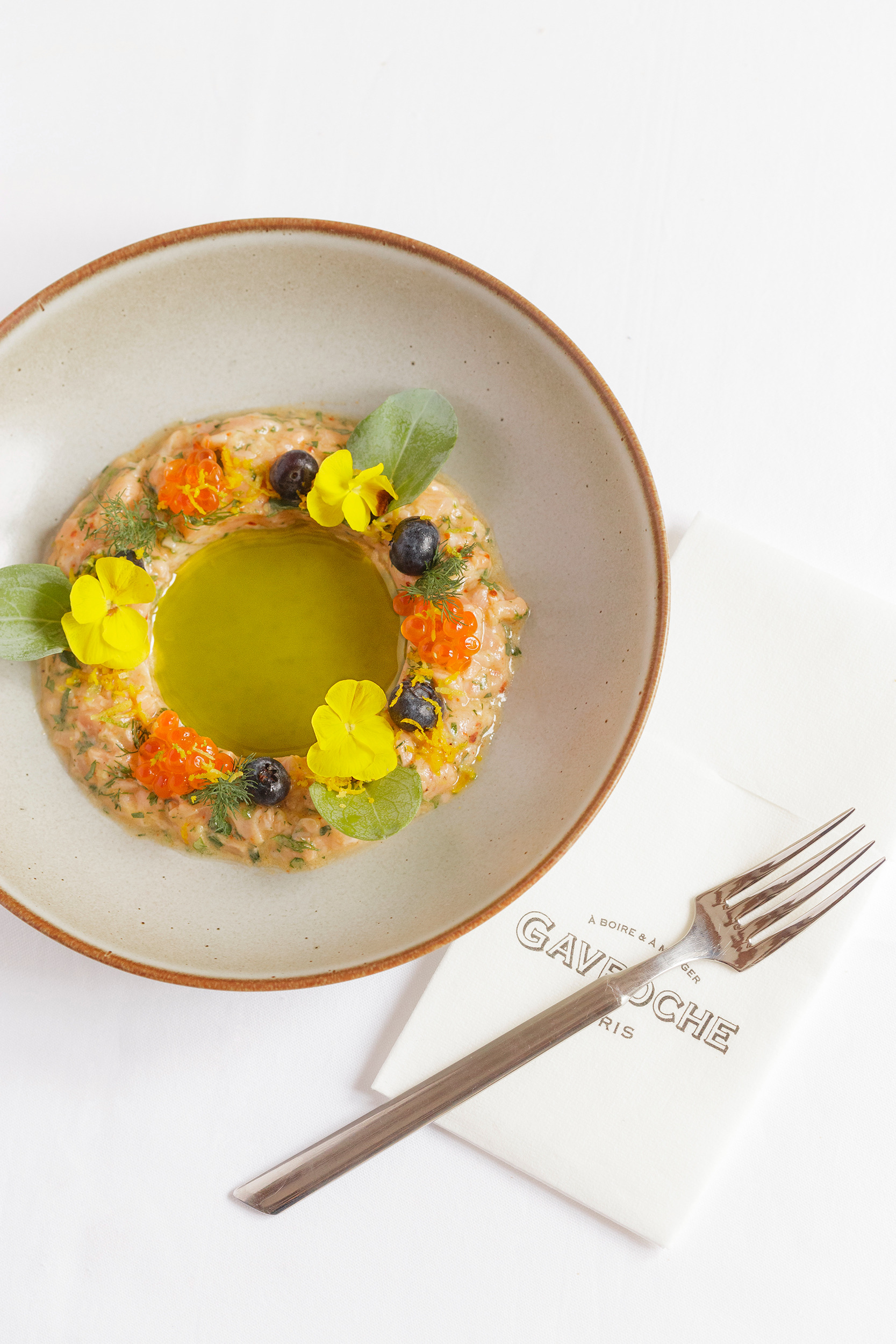 Knife-cut fresh salmon, citrus-ginger marinade, salmon roe and red berries