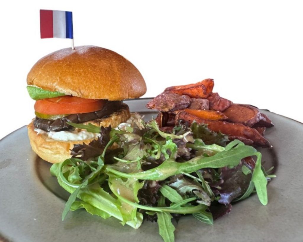 Bun potato, vegetarian patty, grilled eggplant, mint yogurt sauce + salad & sweet potato fries