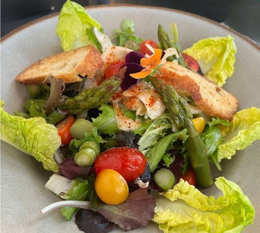 Green, spicy marinated chicken, cheese, cherry tomatoes, avocado, marinated fennel, croutons, lemon vinaigrette
