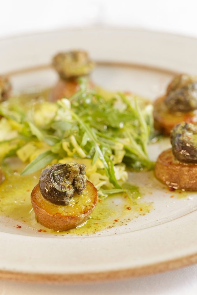 Escargots on potato “bravas“ and parsley butter with melting garlic.