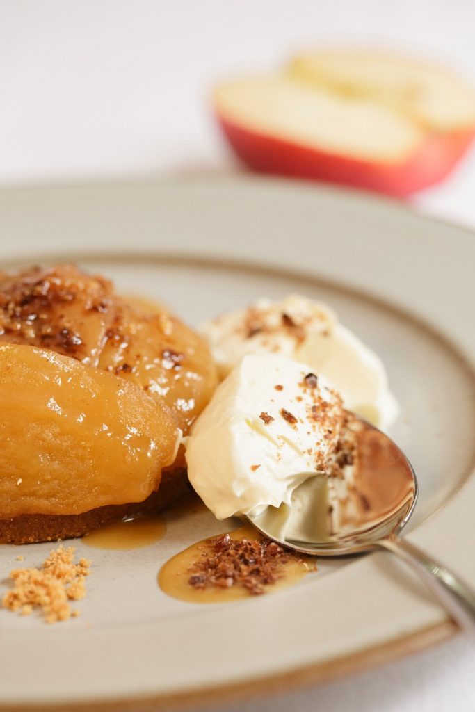 Candied apples caramelized in the oven, served on Breton shortbread with Isigny cream.